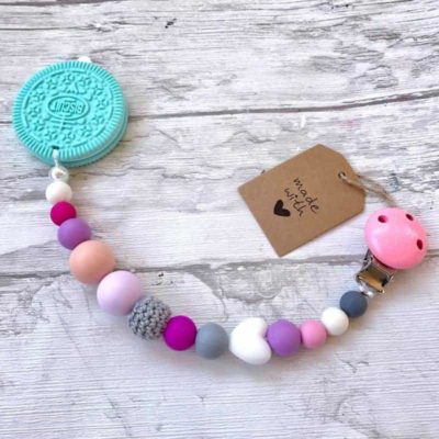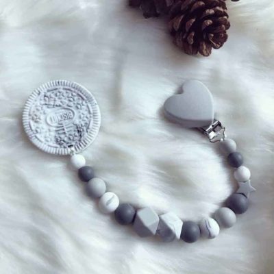 Originální, ručně vyrobený klip, zakončený silikonovou sušenkou nadchne všechny. Pořiďte svému miminku originální doplněk, se kterým se zabaví v kočárku, v sedačce nebo v postýlce. Naše klipy lze kombinovat s háčkovanými korálky, písmenky, i s dalšími zajímavými motivy, které rozzáří úsměv na dětské tváři.