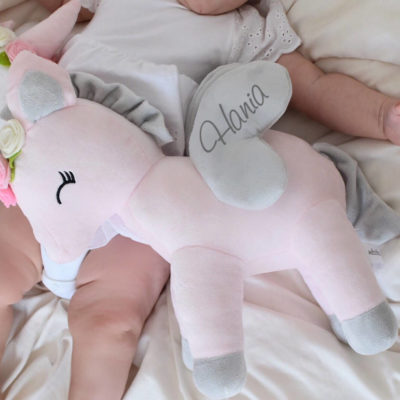 Jednorožci s květinovým věncem v nádherných pastelových barvách se po dlouhé roky stanou oblíbenou hračkou. Jsou měkké a příjemné na dotyk, křídla ve tvaru srdce a „usmívající se“ oči jsou charakteristickými znaky pro tyhle úžasné jednorožce.